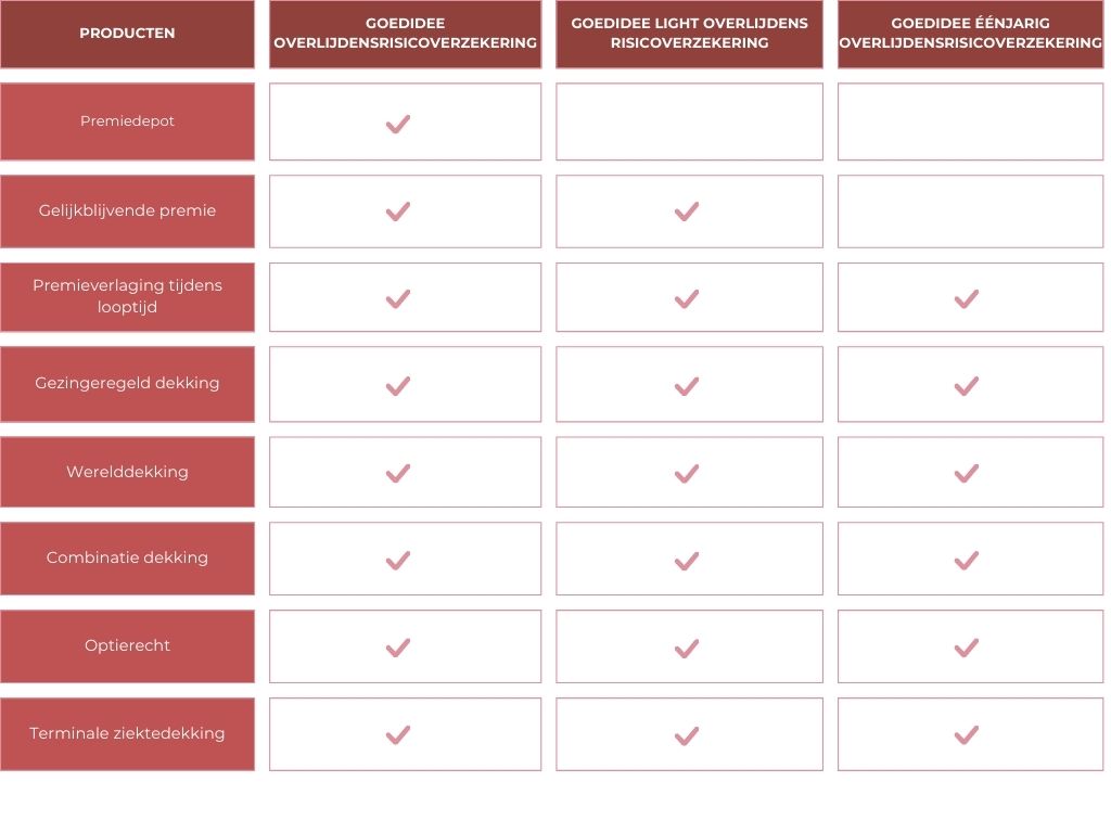 De GoedIdee overlijdensrisicoverzekering heeft verschillende versies, zo is de GoedIdee overlijdensrisicoverzekering ook beschikbaar in het Engels. In de onderstaande tabel kun je de verschillen vinden.